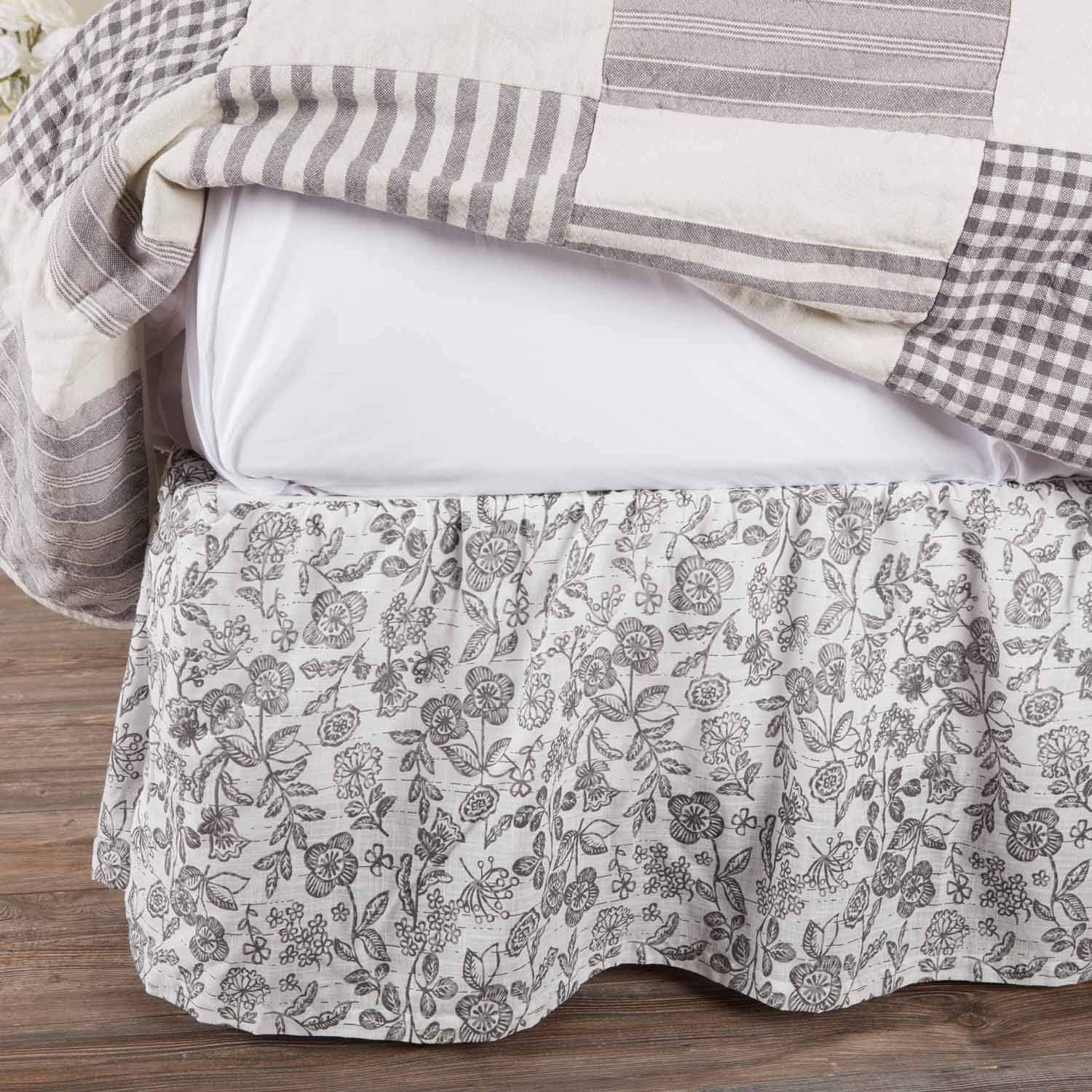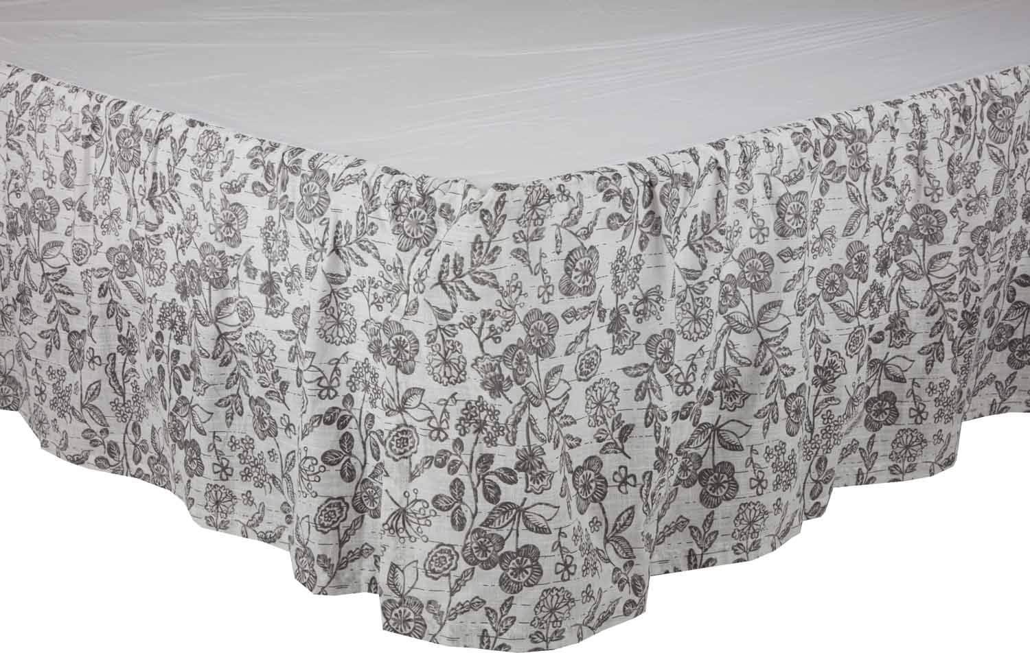 King Floral Bed Skirt w/ 16″ Drop, Gray and Soft White Printed Dust Ruffle, Gathered, Country Cottage, Vintage Farmhouse Bedding